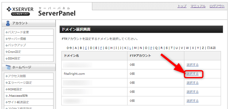 (2) 設定されているドメインが一覧されますので、目的のドメインの右側にある「選択する」リンクをクリックします。