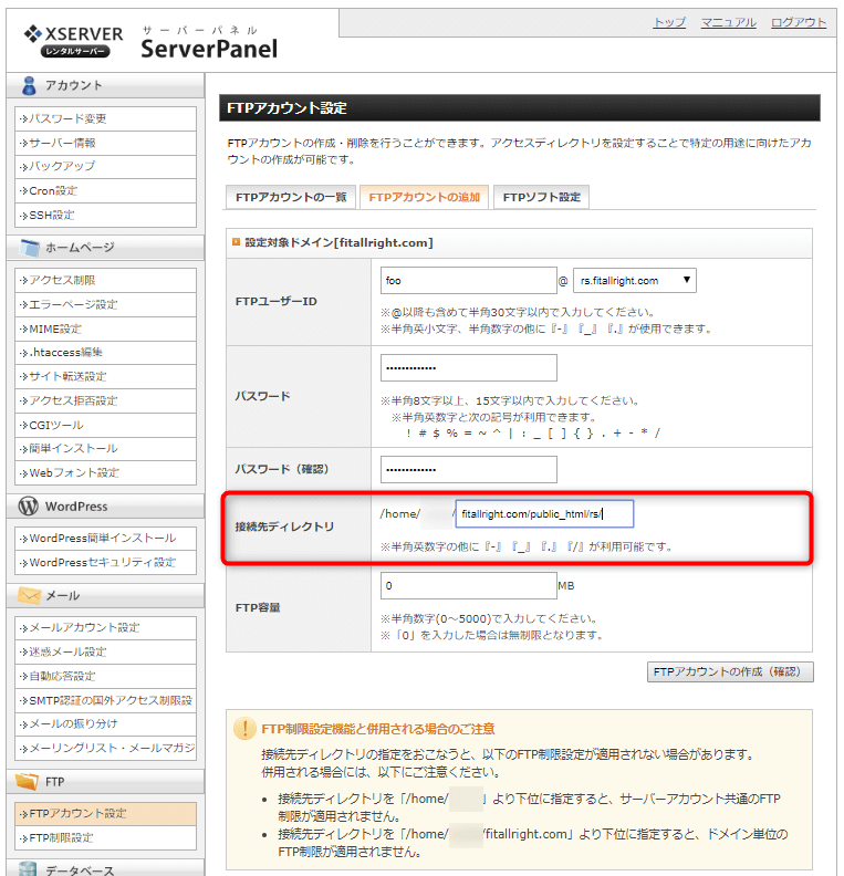 全ての項目を入力したら「FTPアカウントの作成(確認)」ボタンを押します。