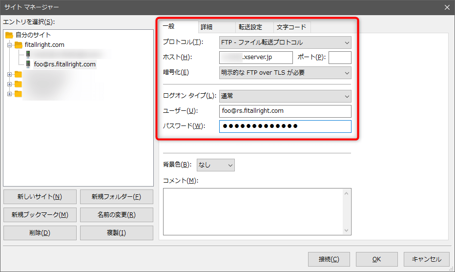 FileZilla のサイトマネージャーで、以下の画面のように [一般]タブ内を設定します。