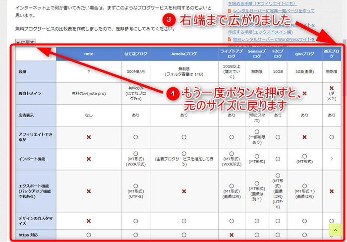 table要素のプロパティを変更して幅を広げ、もう一度ボタンが押されたら元の値に戻す」とうことをやっています。<table>を囲っている<div>のstyle属性値も合わせて変更しています。 - Chrome の場合は、