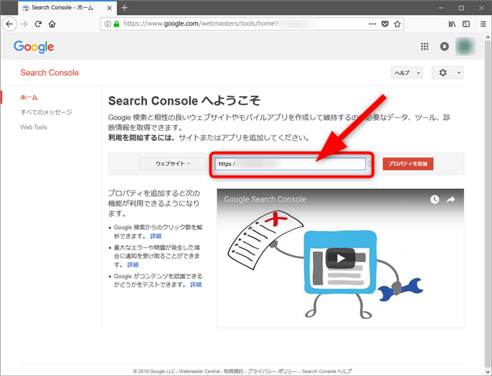 画面真ん中にあるフィールドに、作成したWebサイトのURLを入力して「プロパティを追加」ボタンをクリックします。