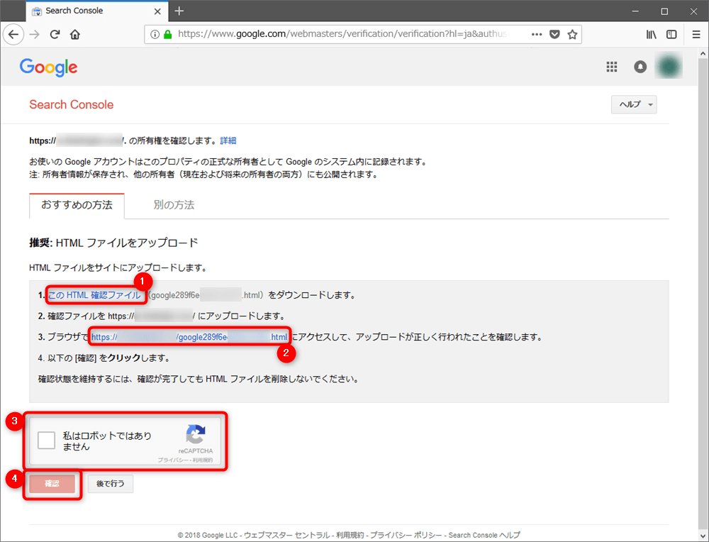 いくつか方法はありますが、ここでは画面上でも選択されている「おすすめの方法(HTML ファイルをアップロード)」で説明します。この方法では、Googleが用意したテキストファイルをあなたのWebサイトにアップロードし、そのファイルにWebからアクセスすることで、あなたがWebサイトの所有者であることを確認します。