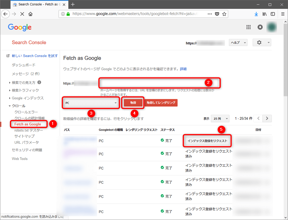 (1) 画面左のメニューから [クロール] – [Fetch As Google] をクリックします()。