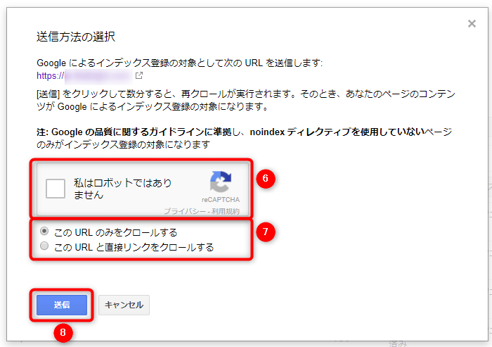 (8) 「この URL のみをクロールする」、「この URL と直接リンクをクロールする」のどちらかを選択します()。