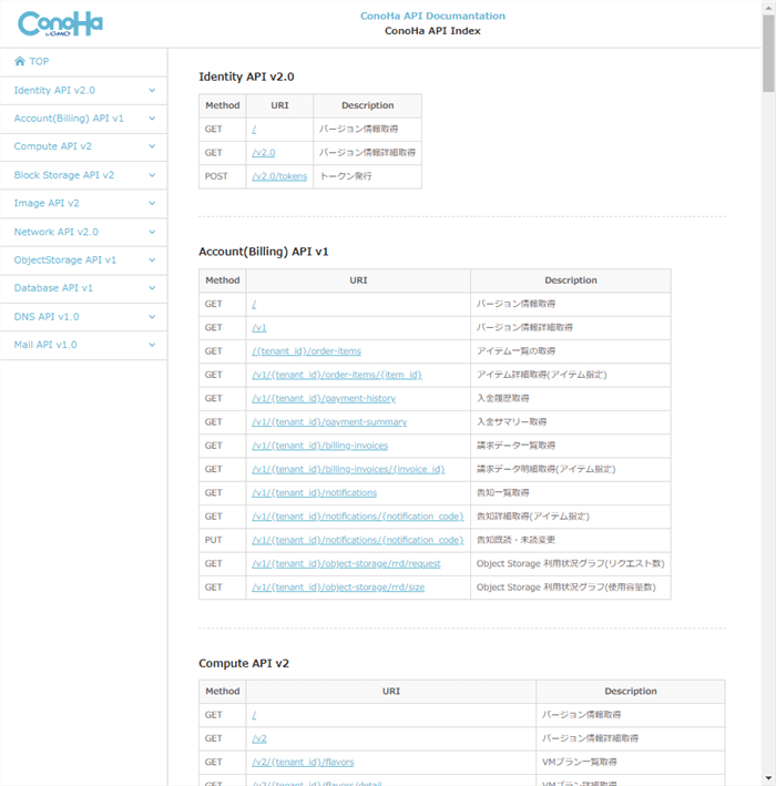 ConoHa API のドキュメントは、「ConoHa API Documentation」にあります。