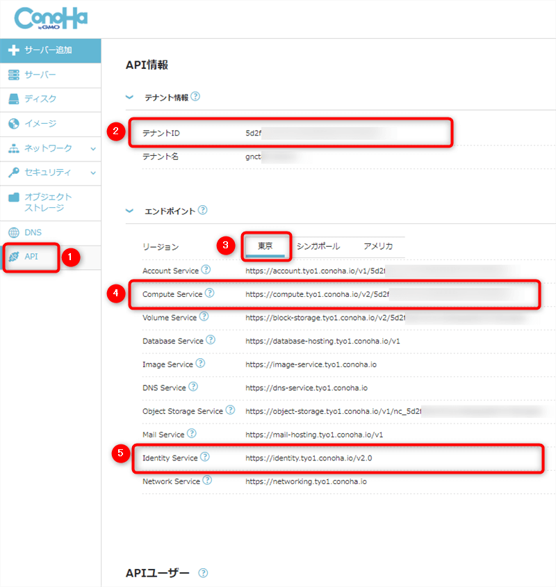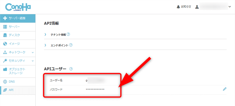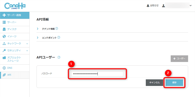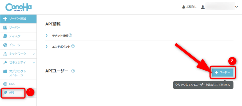 まだ作成していない場合は、ConoHa の管理パネルで、APIユーザーを作成します。
