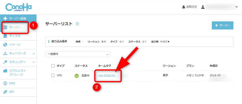 管理パネルサイト – [サーバー] – [サーバーリスト]画面において、操作対象となるサーバーの「ネームタグ」列にあるリンクをクリックします。