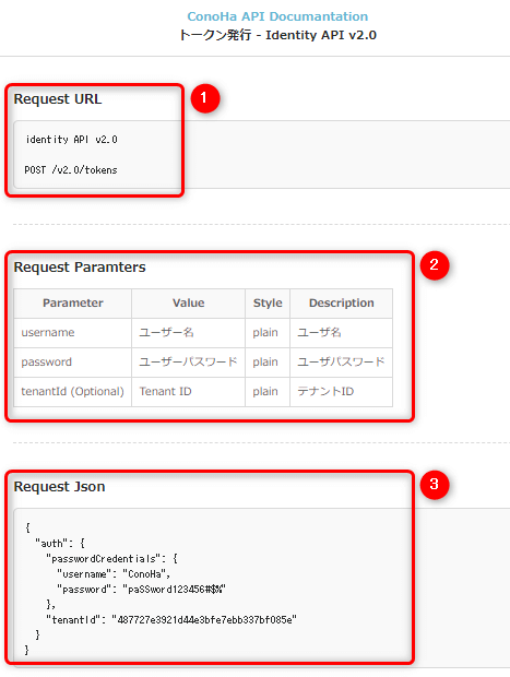 このトークンを取得する処理も1つの API になっており、公式ドキュメントにおける「トークン発行 – Identity API v2.0 / ConoHa API」というのがこれに当たります。