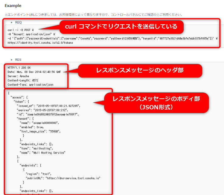 レスポンスに含まれている JSONデータ内のどこにトークンが含まれているかは、スタートアップスクリプト|VPSならConoHa の「Let’s Encryptインストール」用スタートアップスクリプトと、APIを使用するためのトークンを取得する|VPSならConoHa を参考にしました。