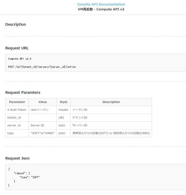 こちらで使っている API は、「VM再起動 – Compute API v2 / ConoHa API」です。