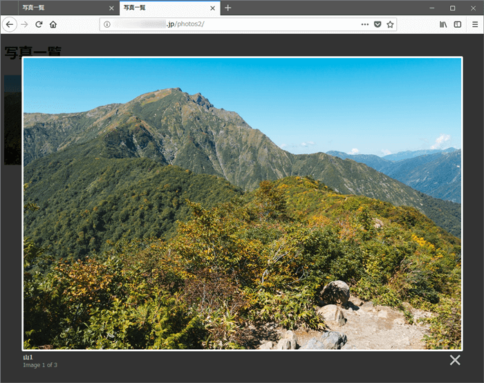 <a href="./yama1.jpg" data-lightbox="yama" title="山その1"><img src="./yama1.jpg" alt="山その1" width="300"></a>