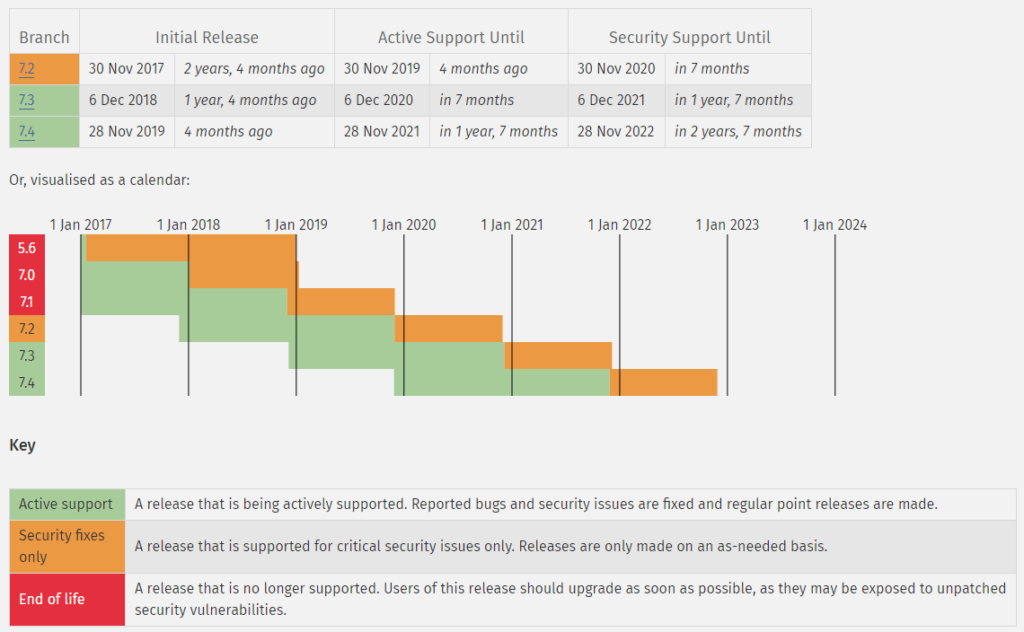 現状、PHPの各バージョンがどのようなサポート状態なのかについて知りたい場合は、レンタルサーバー運営企業のページを見るだけでなく、PHP: Supported Versions も確認することをお勧めします。