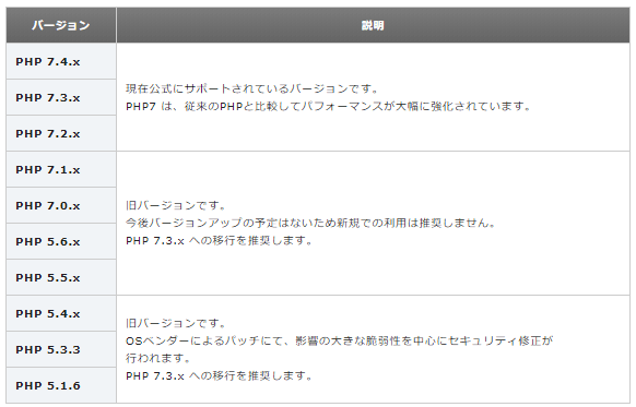 例えばエックスサーバーの PHPのバージョンについて というページには、特定のバージョンに対して「現在公式にサポートされているバージョンです。」や「旧バージョンです。」といった説明が記載されています。