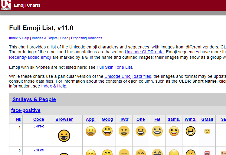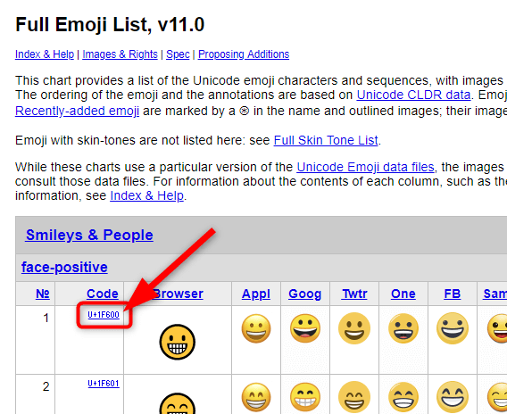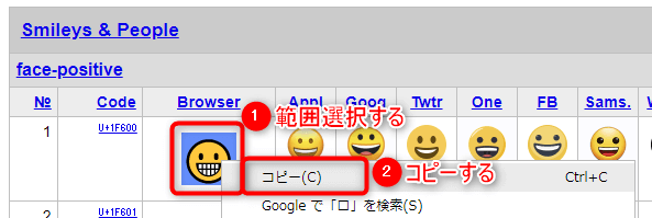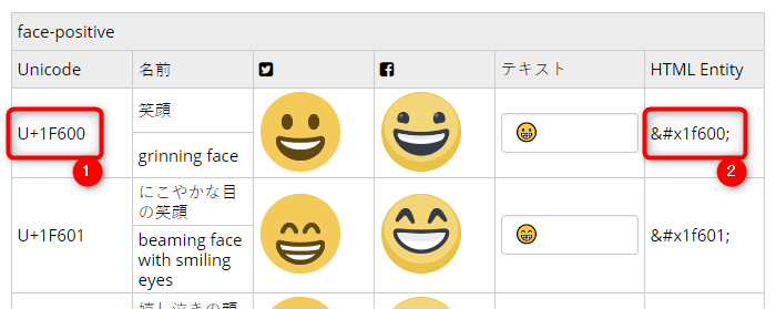 2. 以下の場合、「U+1F600」となっていますが、最初の「U+」を除いた「1F600」が今回欲しい番号です。