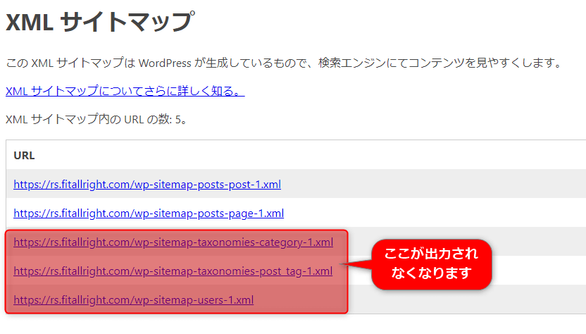 このコードでは、’users’ と ‘taxonomies’ の2種類を除外しています。